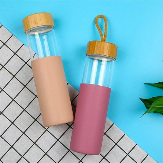 Glass Water Bottle With Wooden Cap & Silicone Cover