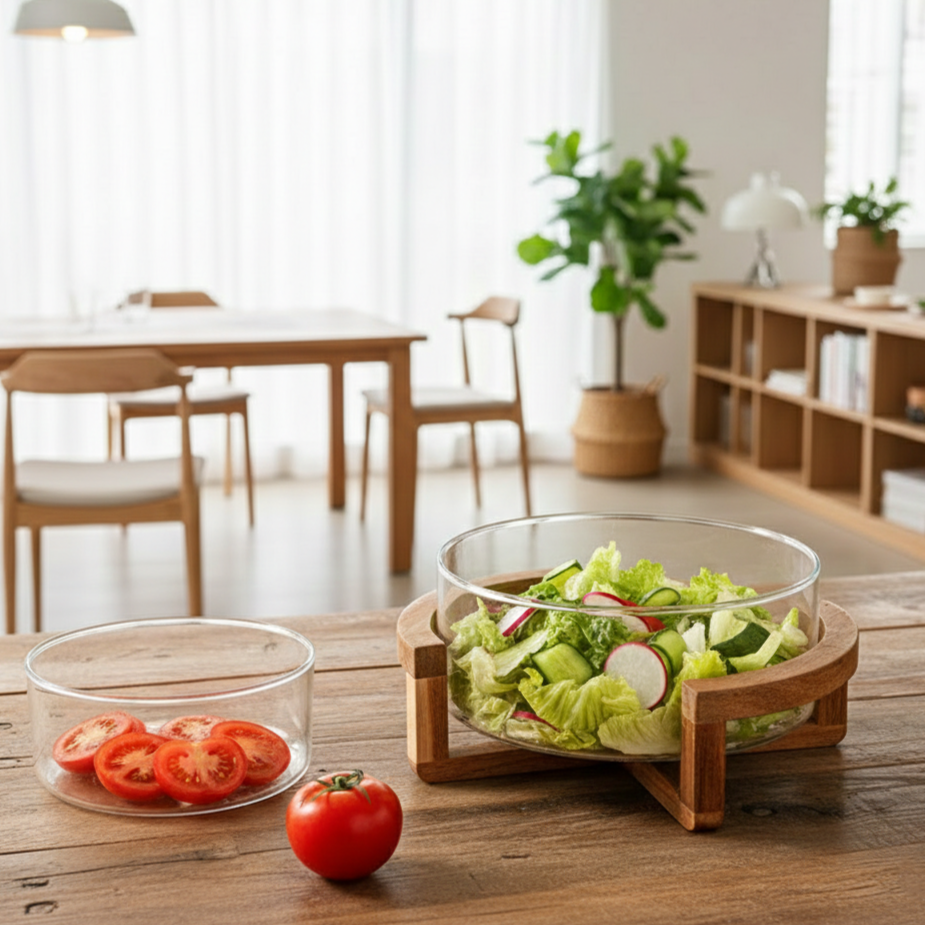 Enhance your kitchen and dining experience with the Classy Glass Serving Bowl with Wood Stand — a stylish and versatile serving set ideal for everything from popcorn, snacks, oatmeal, salads, dips, and seasonings to everyday meals. Crafted for both casual family use and entertaining guests, this elegant bowl combines practicality with modern design to elevate your tabletop.Made from clear, durable glass that shows off your food beautifully, the bowl sits securely on a natural acacia wood base, giving it a rustic yet contemporary appeal. Whether you’re hosting movie nights, serving up hearty breakfasts, or displaying fresh fruit, this serving bowl is a must-have kitchen staple.