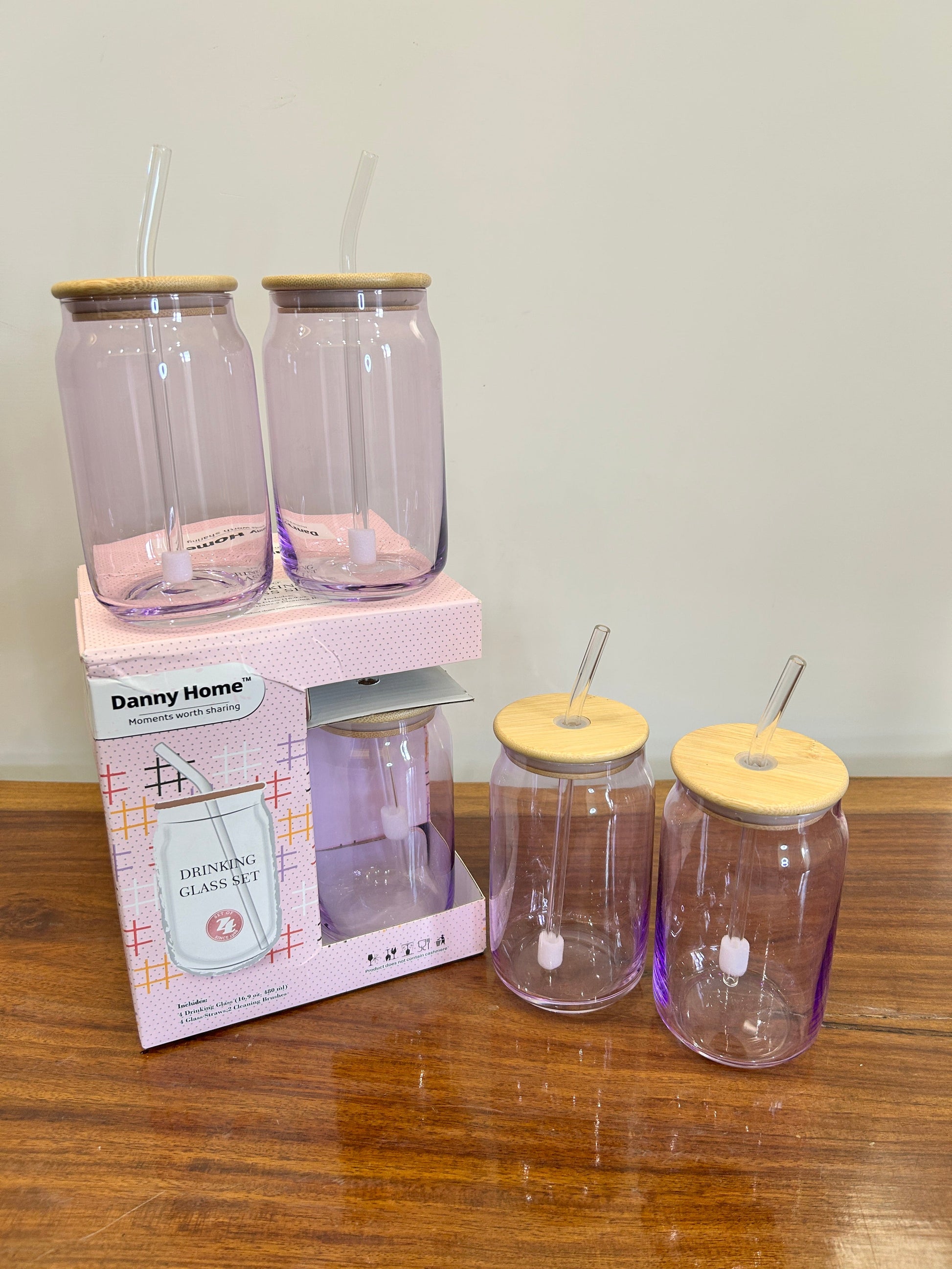 ✅Including 4 Sipper With Wooden Lid, Glass Straw & Cleaning Brush